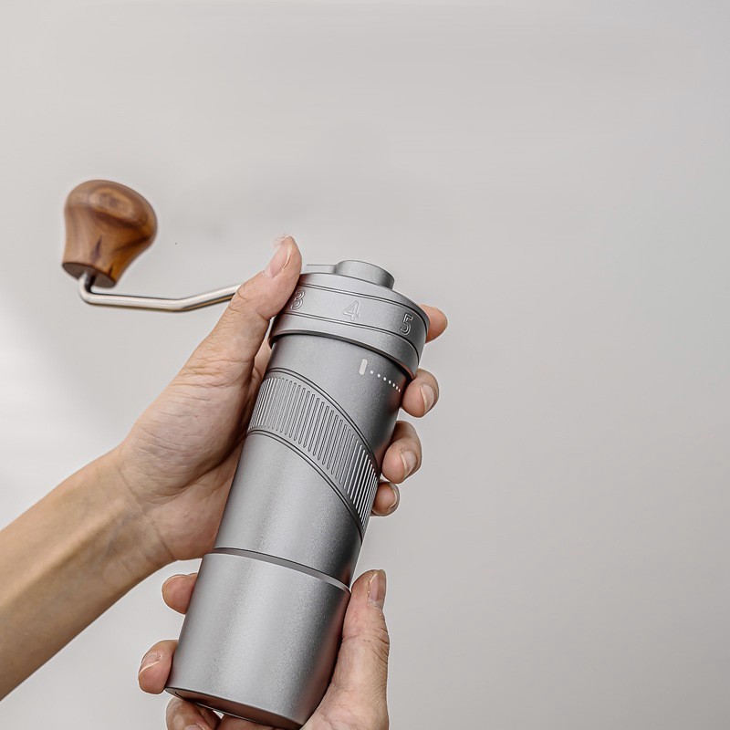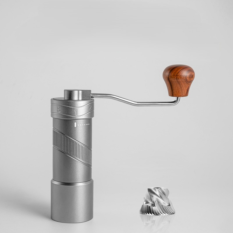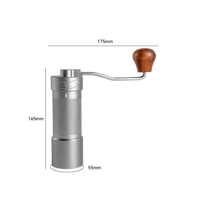 Stainlesssteel manual coffee grinder with external grindsize dial. Features a 304grade steel body, knurled barrel for firm grip, and ergonomic wooden crank handle. Compact (Ø55×165 mm) and portable, it delivers uniform grounds from extrafine to coarse for espresso, pourover, Frenchpress and more. Ideal for home, office or travel.